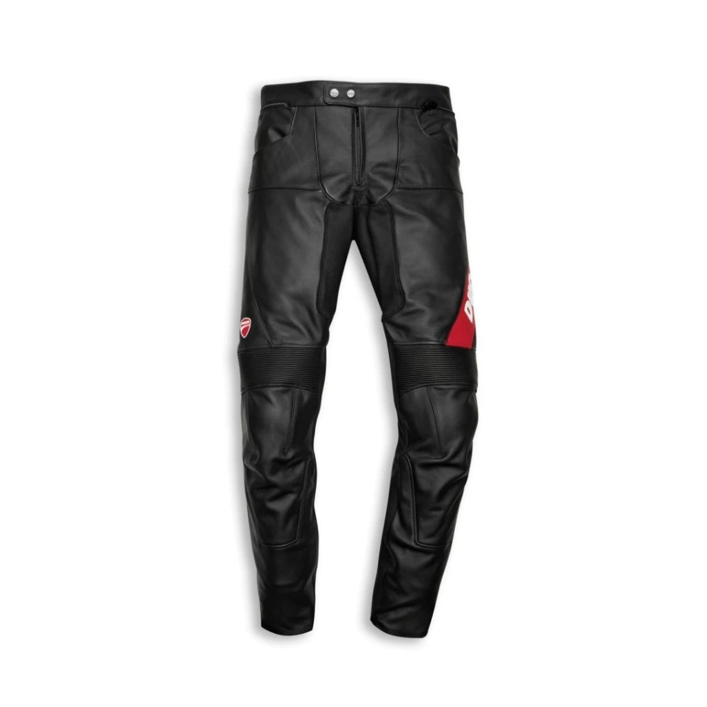 Disfruta cada curva, con los pantalones de cuero Company C4 producidos por Dainese en exclusiva para Ducati y específicamente estudiados para un uso deportivo en carretera. Realizados de cuero vacuno suave y resistente, ofrecen una óptima libertad de movimiento. La seguridad de la prenda, certificada CE, es garantizada por las protecciones en la tibia y la rodilla y por los suaves refuerzos en la zona de la cadera. El forro de Nanofeel® y las aplicaciones elásticas en las rodillas maximizan el confort, mientras que la práctica cremallera permite la combinación con todas las chaquetas de la colección, dándole la máxima versatilidad.