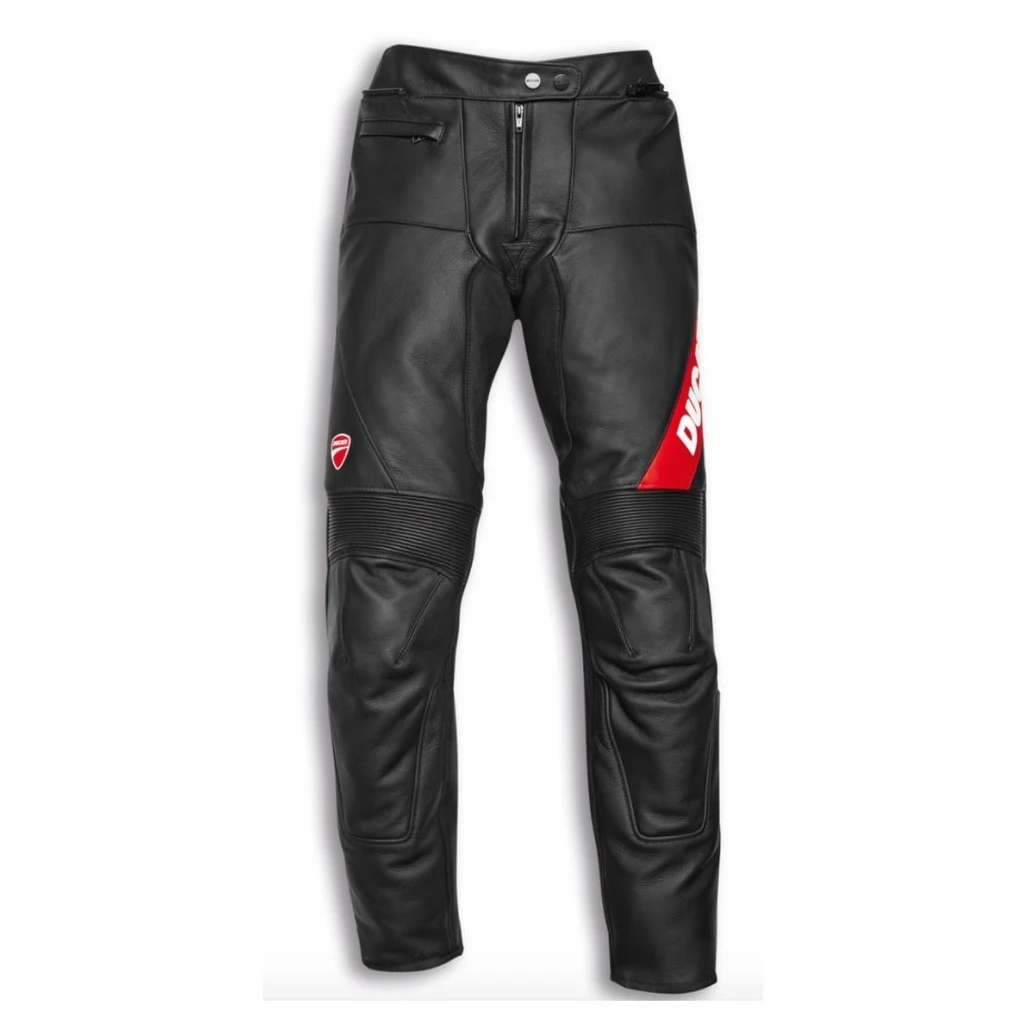 Disfruta cada curva, con los pantalones de cuero Company C4 producidos por Dainese en exclusiva para Ducati y específicamente estudiados para un uso deportivo en carretera. Realizados de cuero vacuno suave y resistente, ofrecen una óptima libertad de movimiento. La seguridad de la prenda, certificada CE, es garantizada por las protecciones en la tibia y la rodilla y por los suaves refuerzos en la zona de la cadera. El forro de Nanofeel® y las aplicaciones elásticas en las rodillas maximizan el confort, mientras que la práctica cremallera permite la combinación con todas las chaquetas de la colección, dándole la máxima versatilidad.